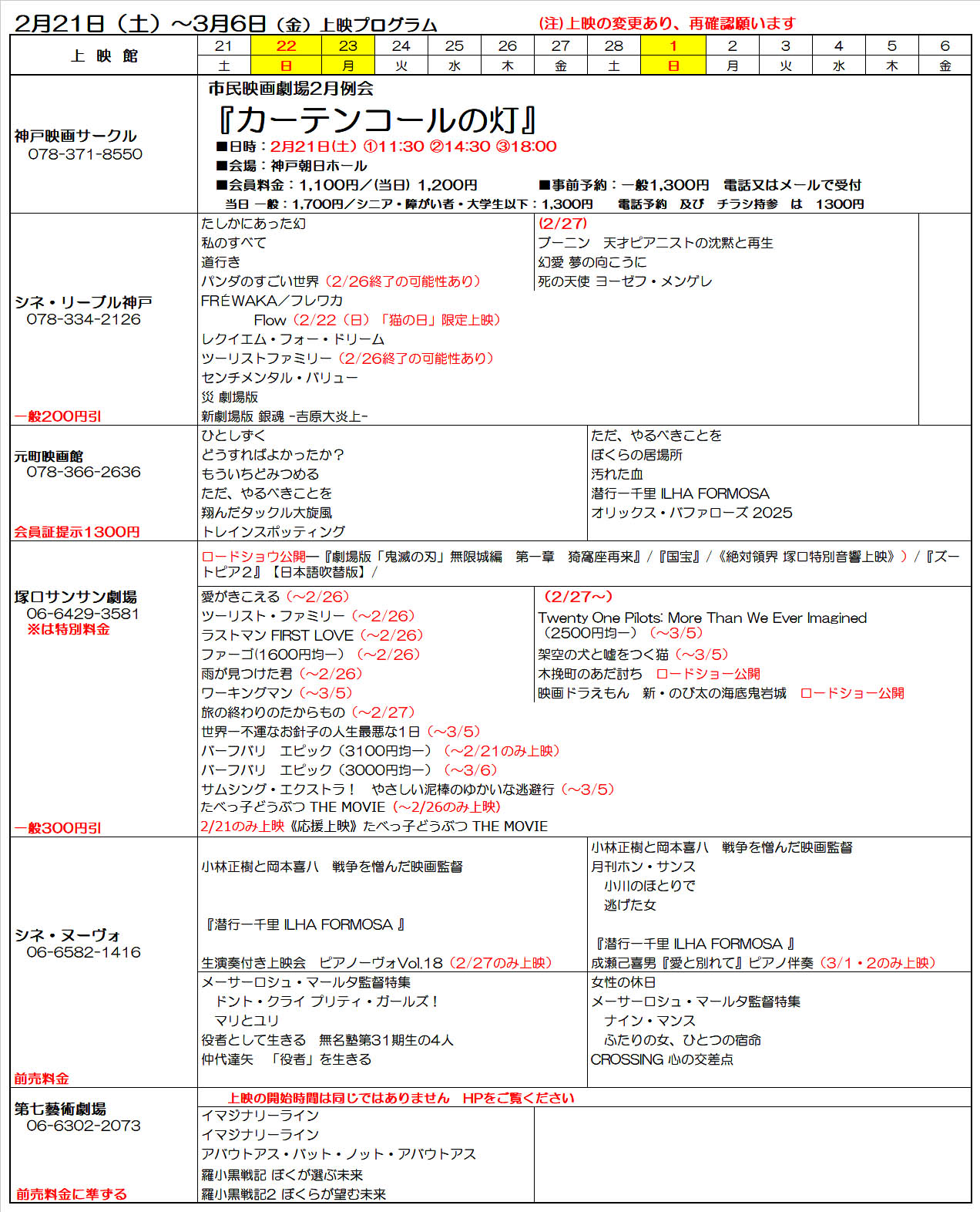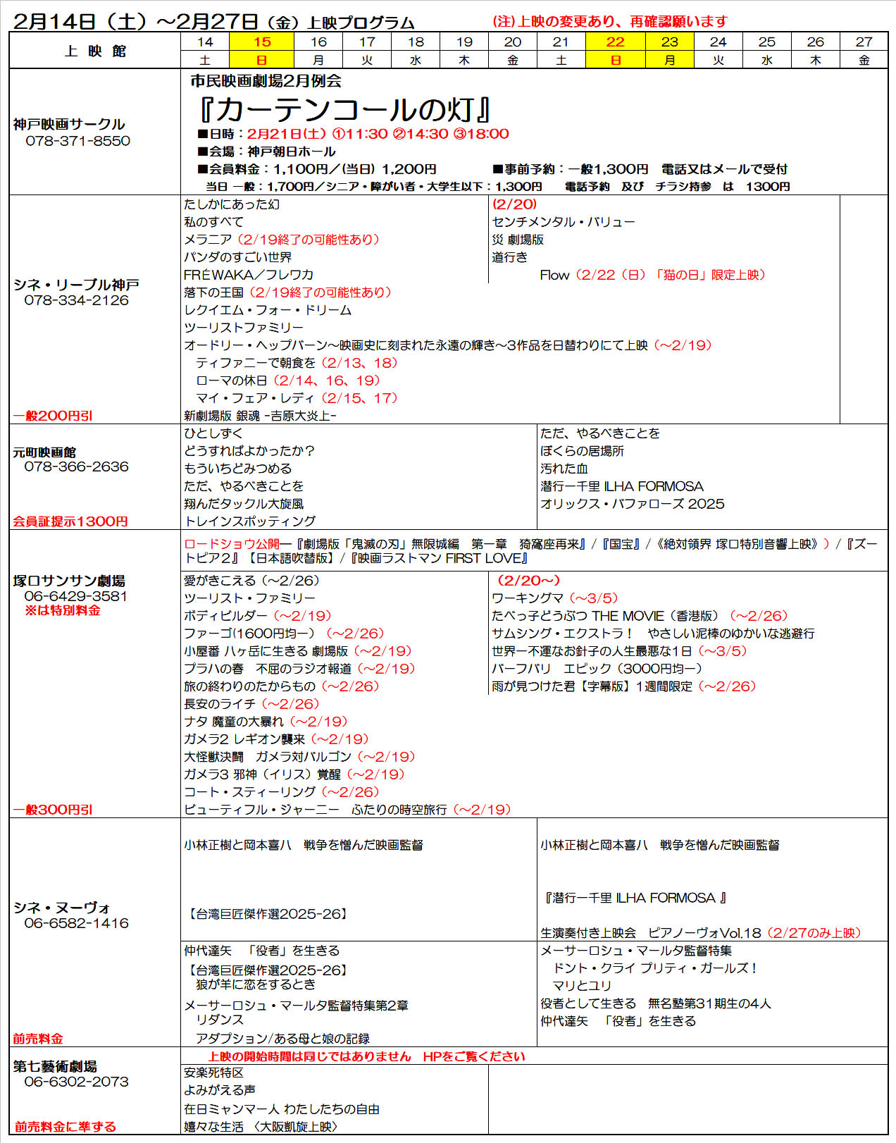 会員割引映画館(2/14~2/27) 🔳トップページへ 神戸映サの会員割引映画館(窓口で会員証をご提示ください) 次回の更新は2/28(土)上映の変更がありますので映画館のHPをご覧ください🔳シネ・ヌーヴォ(前売料金)🔳シネ・リーブル神戸(一般200円引き)🔳元町映画館(1300円均一)🔳塚口サンサン劇場(一般300円引き)🔳第七芸術劇場(前売金に準ずる)