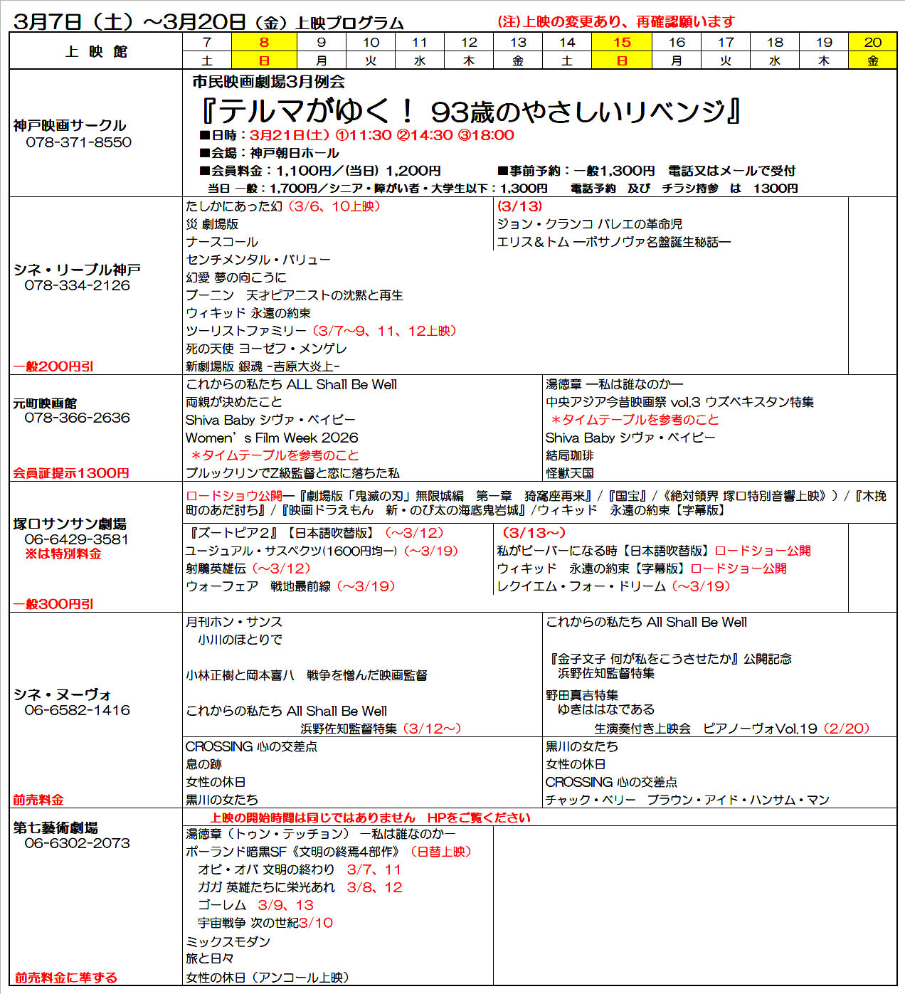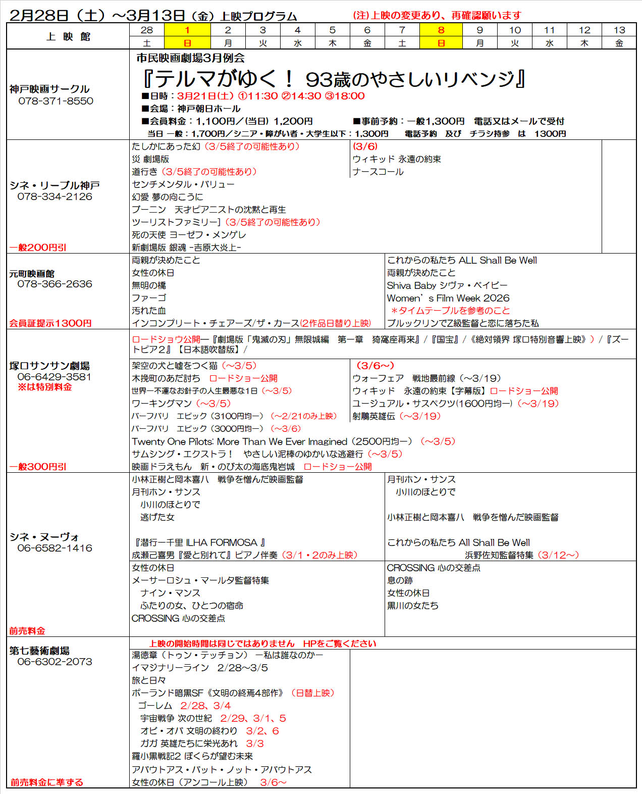 会員割引映画館(2/28~3/20) 🔳トップページへ 神戸映サの会員割引映画館(窓口で会員証をご提示ください) 次回の更新は3/14(土)上映の変更がありますので映画館のHPをご覧ください🔳シネ・ヌーヴォ(前売料金)🔳シネ・リーブル神戸(一般200円引き)🔳元町映画館(1300円均一)🔳塚口サンサン劇場(一般300円引き)🔳第七芸術劇場(前売金に準ずる)